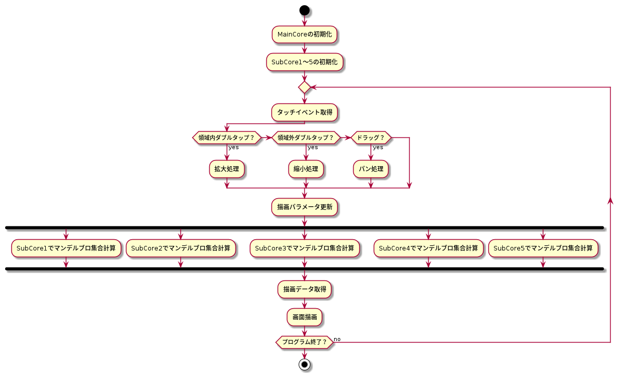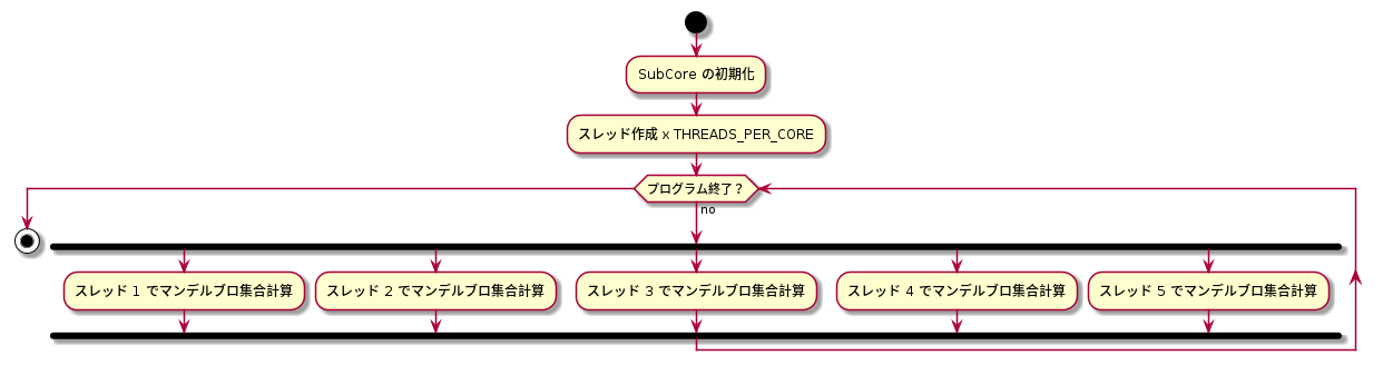 まるでオーケストラのように、メインコアと5つのサブコア、そして複数のスレッドが協調して動作することで、マンデルブロ集合の神秘を解き明かすための壮大な演奏が始まります。