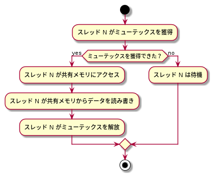そこで、このプログラムでは、ミューテックス という、共有メモリへのアクセスの秩序を守る守護者を配置しています。