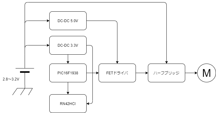 3Vという低電圧でプラズマダッシュモータ(始動電流25A、無負荷電流1.8A)を駆動できるモータドライバICを見つけられなかったので、FETドライバ+FETとしました。また、部品の実装面積を極力抑えるために、Hブリッジ構成はあきらめ、ハーフブリッジ構成としました。