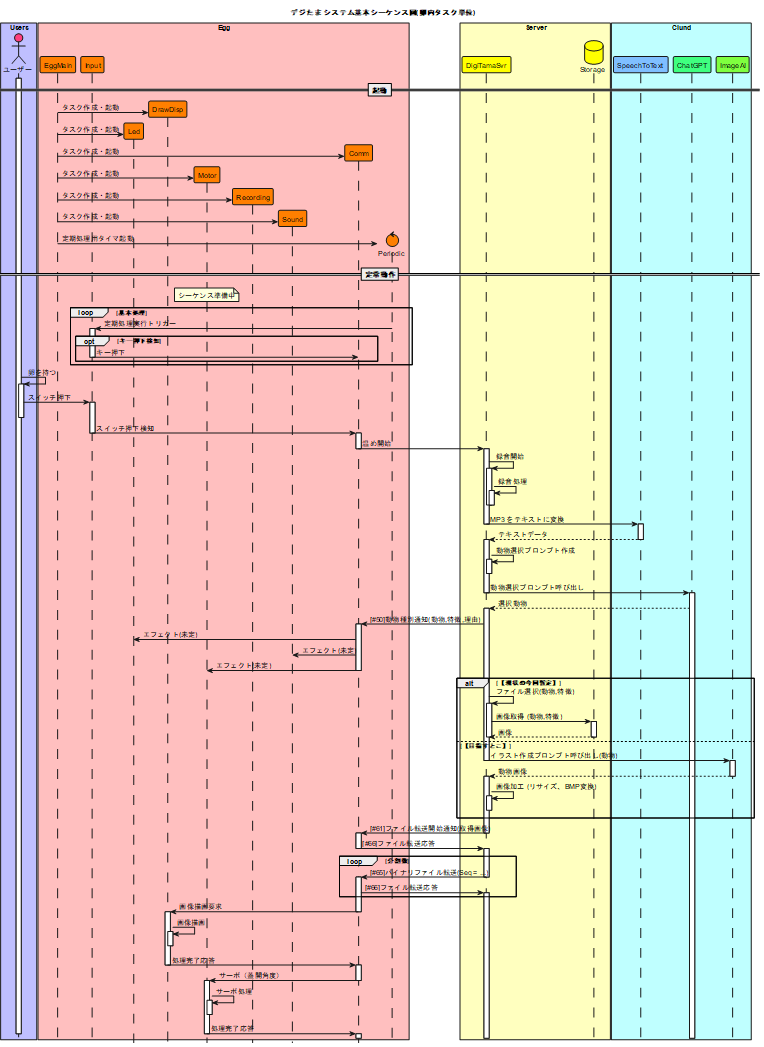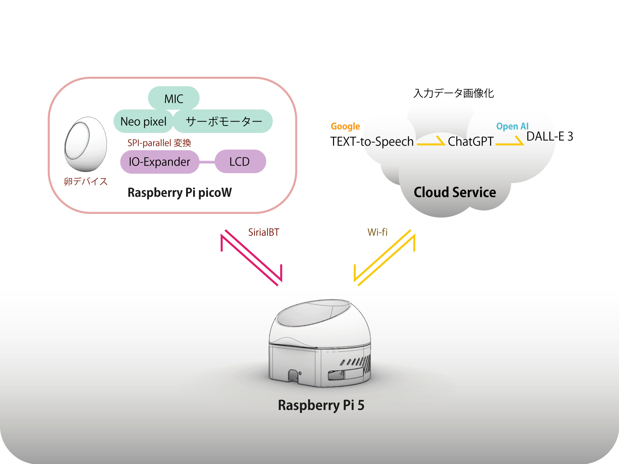 このシステムは、卵型デバイスとRaspberry Pi 5がクラウドサービスと連携し、ユーザーにキャラクター生成の体験を提供します。