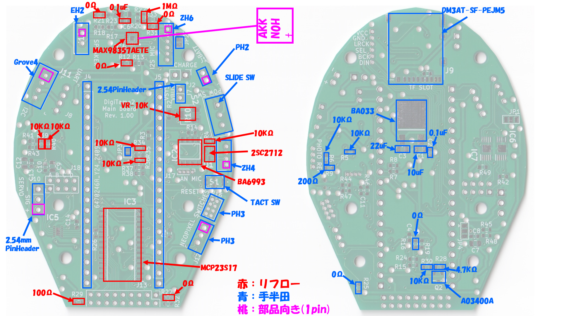 部品は下の写真の様に実装します。(未使用部品もありますが後述します)