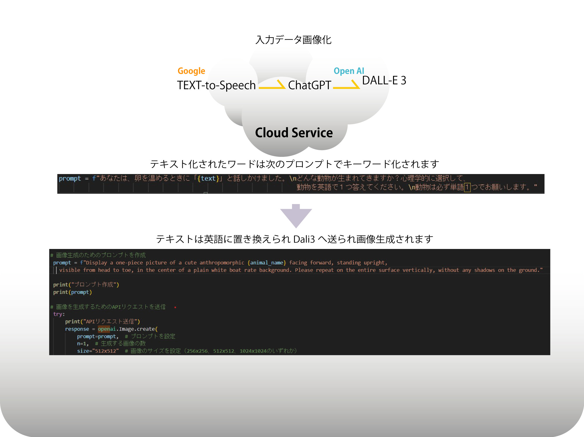 クラウド側は Google の TextToSpeech サービス、 OpenAI の API 、DALL-E3 を使い連携しています。