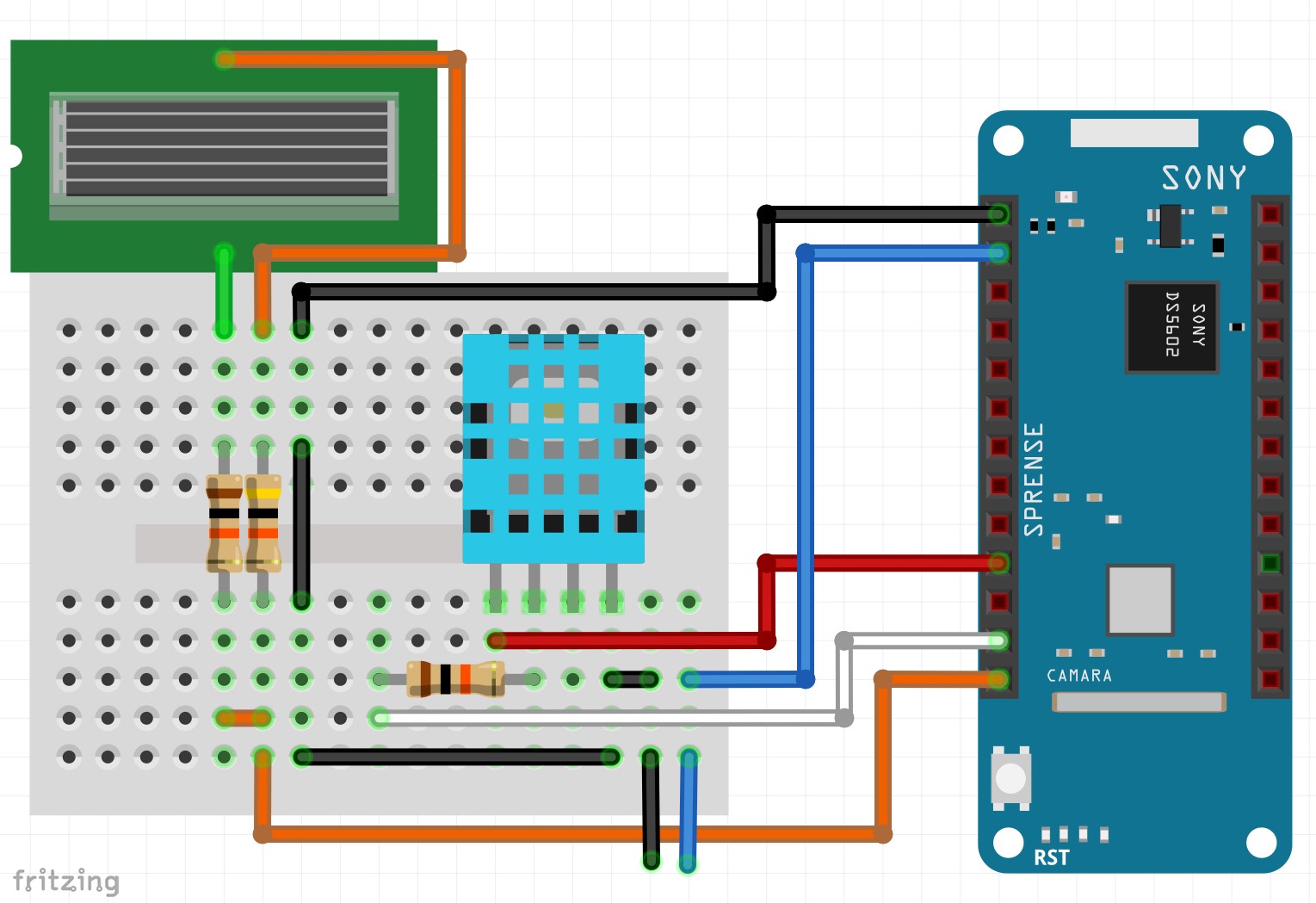 DHT11はSPRESENSEからに3.3V、データ線に10kΩ抵抗を直列にいれています。