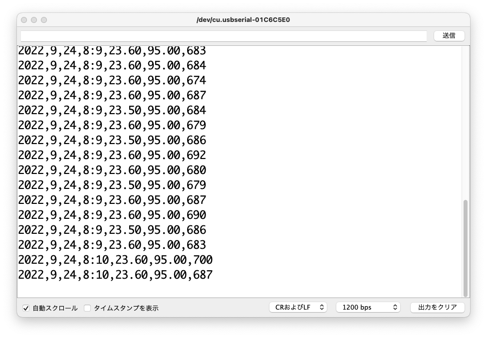 Arduino-IDEのシリアルコンソール画面です。使うときはパソコン側でシェルスクリプトつかい