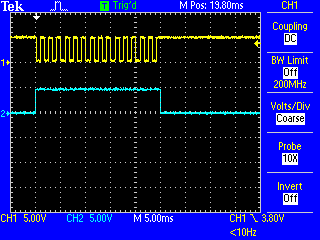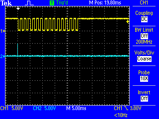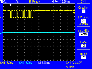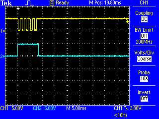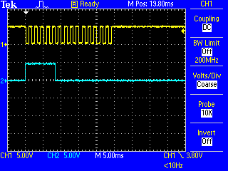 上の波形(黄色)がTXD、下の波形(水色)がPIN13です。