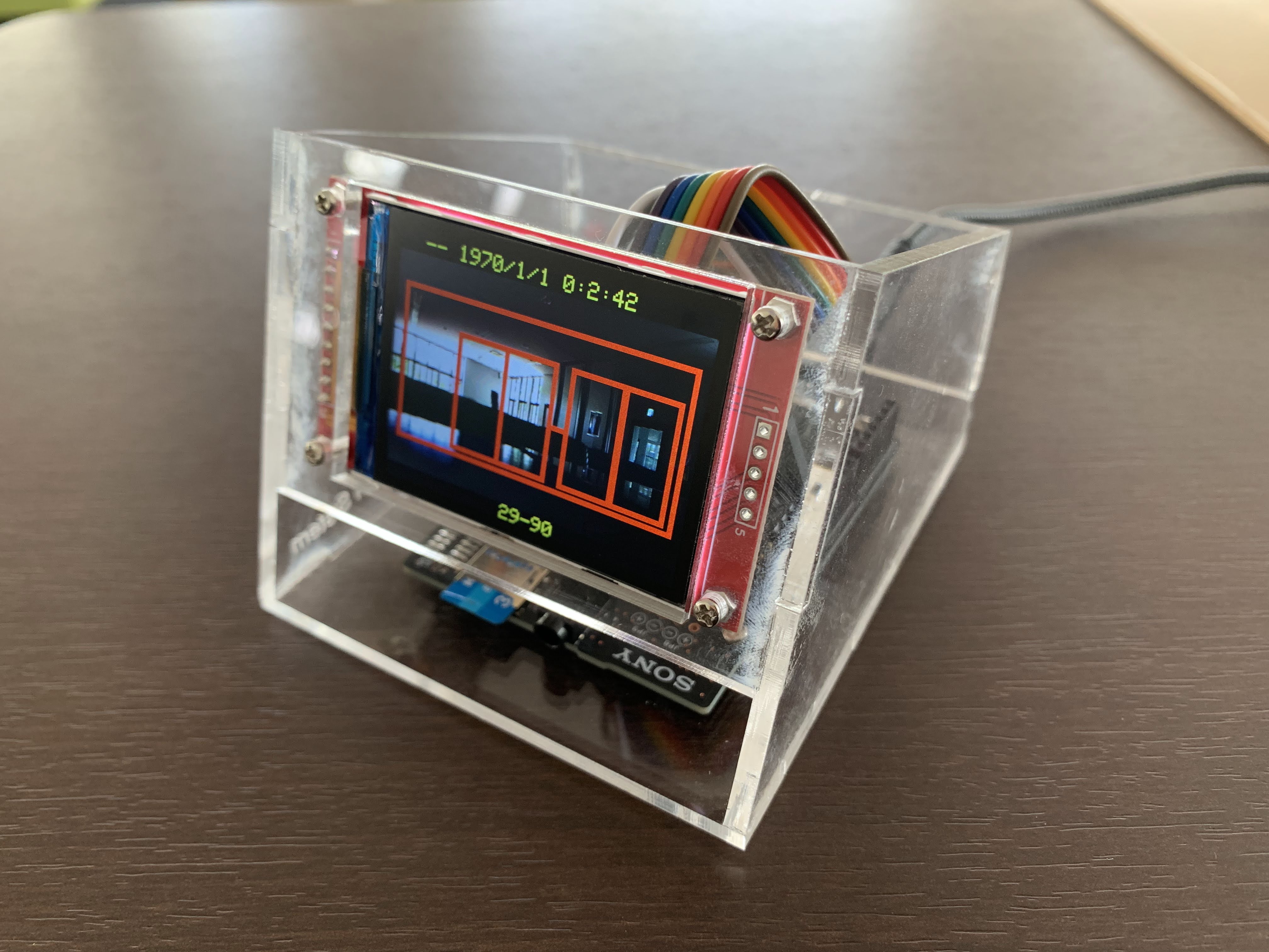 LCDを利用するのが今回初めてだったため、サンプルプログラムを読み漁り、理解していきました。まずは映像を表示させるところから理解し、文字を表示させたり、枠を表示させたりのやり方について試行錯誤を重ねていきました。下記に公開されているGitにあるSpresense_number_recognition.inoやSpresense_camera_preview.inoなどのサンプルプログラムを読みました。