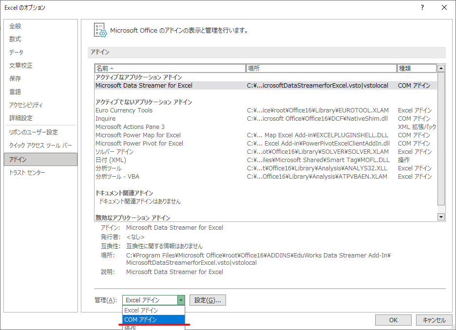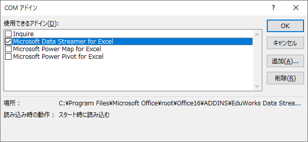 そして、Microsoft Data Streamer for Excelにチェックを入れてOKを押します。