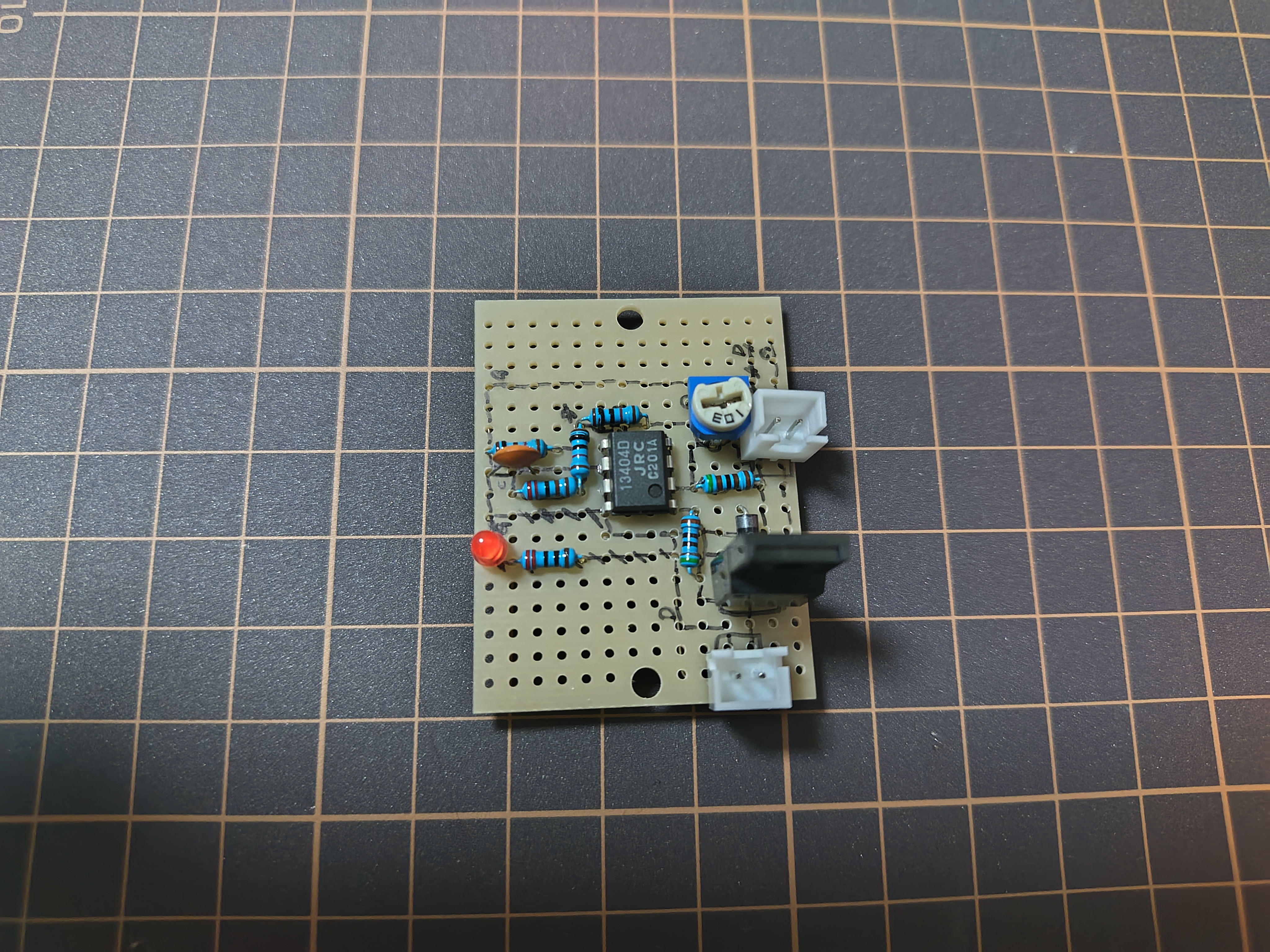 問題なく動作していそうだったので、回路をユニバーサル基板上にはんだ付けしました。可変抵抗は手元にあったドライバーで調整するタイプを使っていますが、実用上は指で回せるタイプのほうが便利そうです。