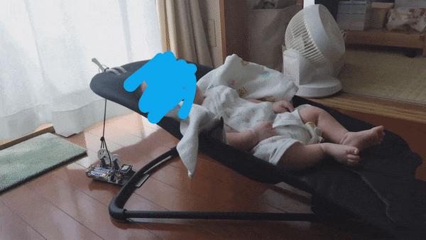 バウンサーは、抱っこの代わりにゆらゆらと揺れることで赤ちゃんの機嫌をとってくれる非常に頼もしい存在です。しかし、抱っこよりも遥かに楽とはいえ、腕の負担やバウンサーへの拘束は、長時間になるとなかなかこたえます。バウンサーを自動で揺らすことができればその間にちょっとした家事を片付けることができ、その恩恵は計り知れません。世の中には電動バウンサーというものも存在しますが、重量があり、高価なので導入をためらってしまいます。