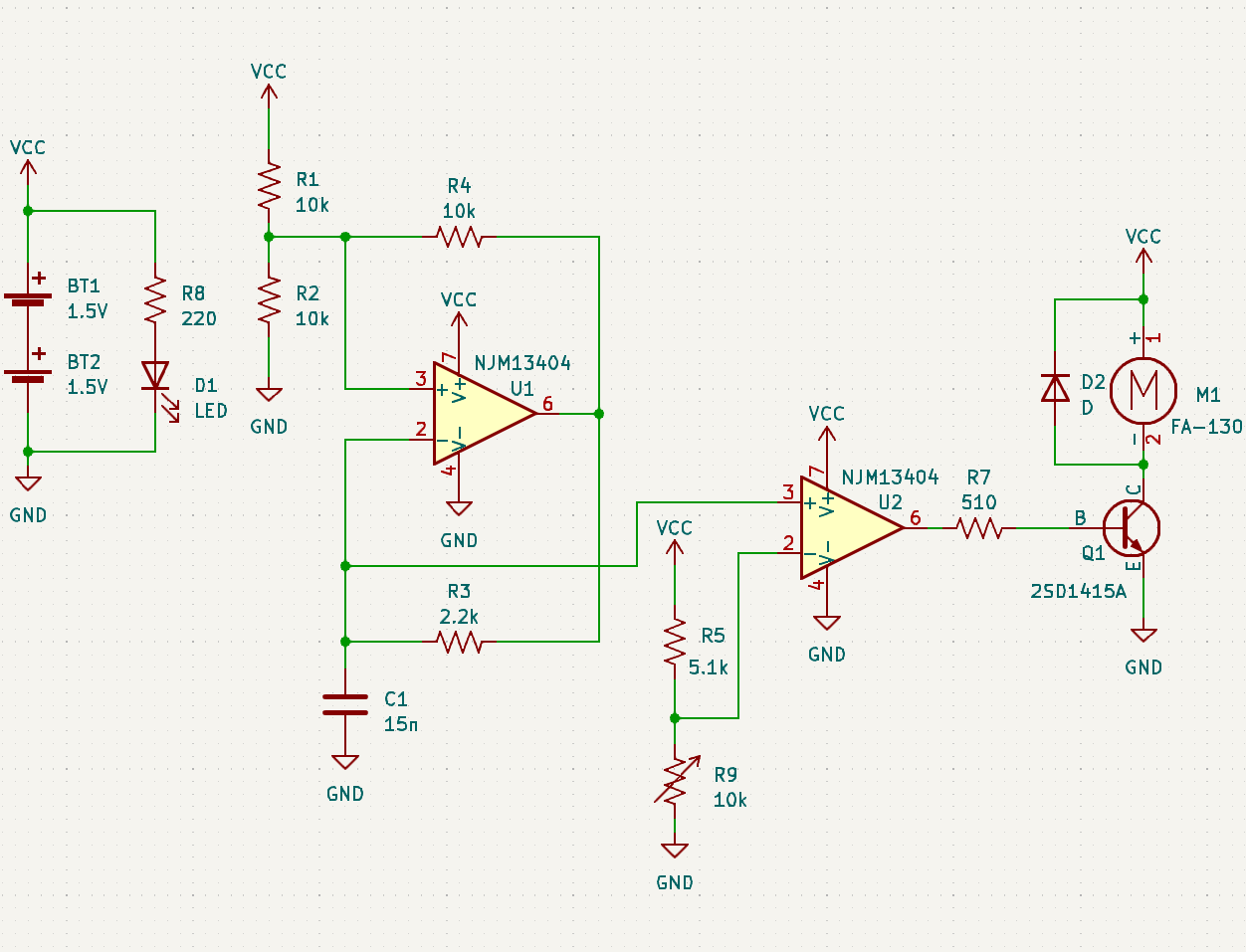 一段目のオペアンプは矩形波を発生させています。そのおまけとして得られる三角波(に近い信号)を二段目のオペアンプの入力としています。二段目のオペアンプはコンパレータとして動作しており、その参照電圧は可変抵抗で調整できるようになっています。ここでパルス幅の調整が可能で、その出力はPWM信号です。PWM信号はモータ駆動用トランジスタを介してモータを駆動します。