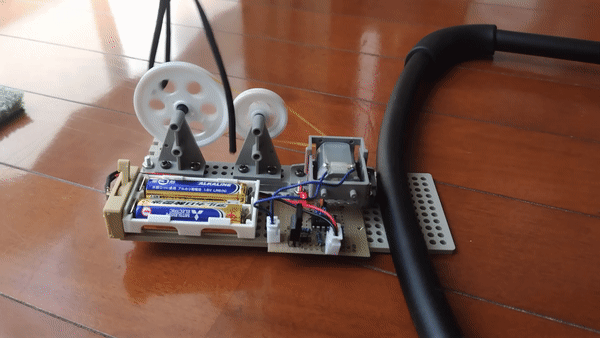 続いてバウンサー自動揺らし機に実装した回路を取り付けました。バウンサーの先端に洗濯ばさみを固定し、プーリとの間を100均で買ったゴムひもでつないでいます。プーリーユニット、電池ボックス、ユニバーサルプレートは先行例で紹介されているTAMIYA製の同じものを使用しています。動画は回転数の調整を行ったあとの状態です。手で揺らした時に近い、自然なタイミングでの揺れが実現できていることがわかります。