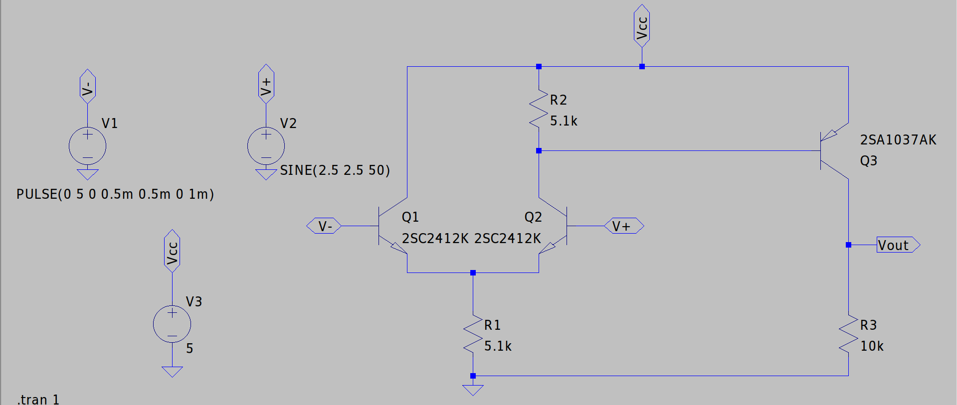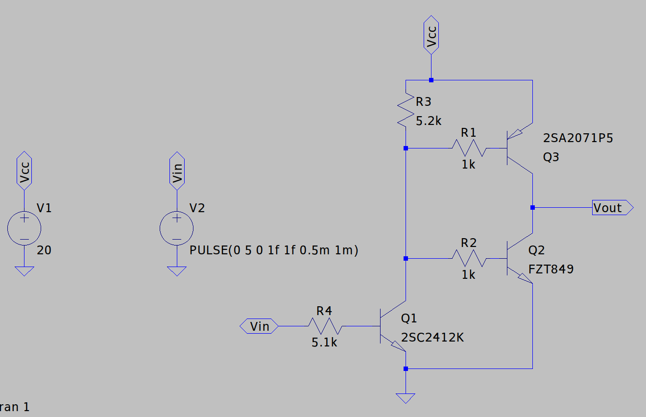 このような回路を用いると5Vのパルス振幅を電源電圧一杯まで振りきることができます。ですがトランジスタはNPN(Nch),PNP(Pch)の両方を用意しており、同じ接合を用いるには工夫を行う必要があります。