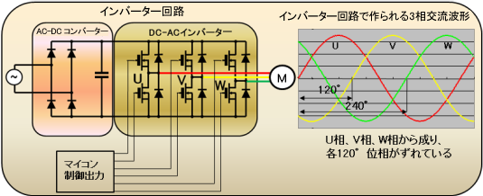 一般家庭のコンセントの単相交流から三相交流を作り出すにもVVVFが必要となります。