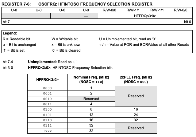 データシートのOSCTUNEレジスタの前ページにはOSCFRQレジスタの説明がある。これによるとNOSC=110(つまりRSTOSC = HFINT1)なら1, 2, 4, 8, 12, 16, 32MHzが選べる。うん?分周器で得られるよね。。。いや待てよ、12MHzがあるぞw そしてRSTOSC=HFINT32なら24Hzもあるw。