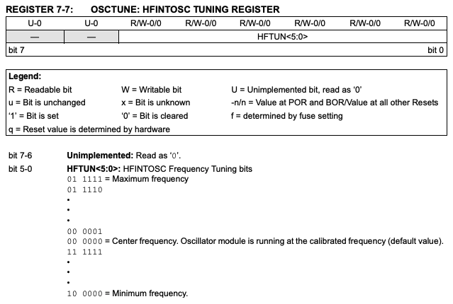 ほとんどのPIC16F系には内蔵オシレータの周波数を調整するためのOSCTUNEレジスタがある。オシレータ32MHzでCLKOUTが8MHzになるが、OSCTUNEで7.8MHzから8.3MHz程度まで調整できた。ー9%〜+4%くらいの調整幅のようだ。