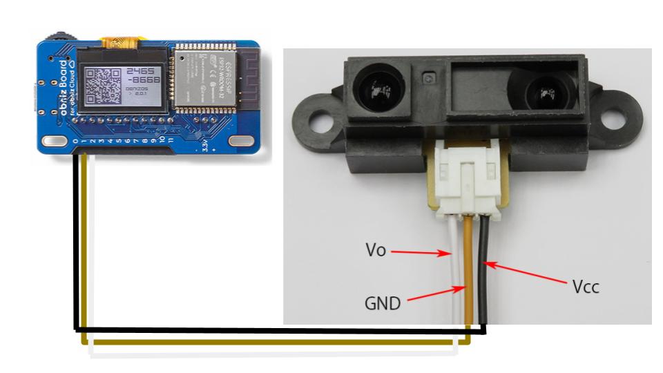 var sensor = obniz.wired("GP2Y0A21YK0F", { vcc: 0, gnd: 1, signal: 2 });