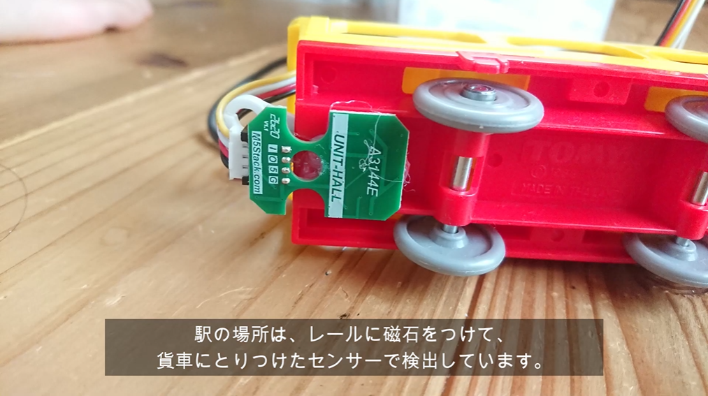 自動亭発車機能はホールセンサと言う磁石を検出するセンサをつかって停車位置を検出して行います。例えば駅を配置する部分のレールに磁石を貼りつけて置き、車両の下に取り付けたホールセンサで位置を検出します。