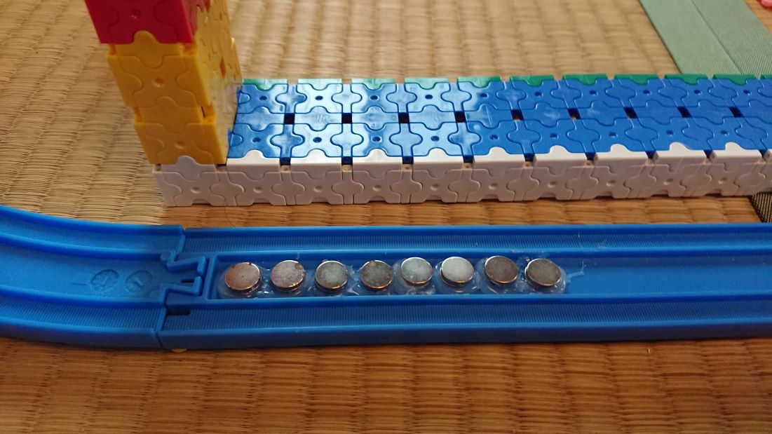 自動運転機能では、このように磁石を取り付けたプラレールの上で自動的に停発車します。