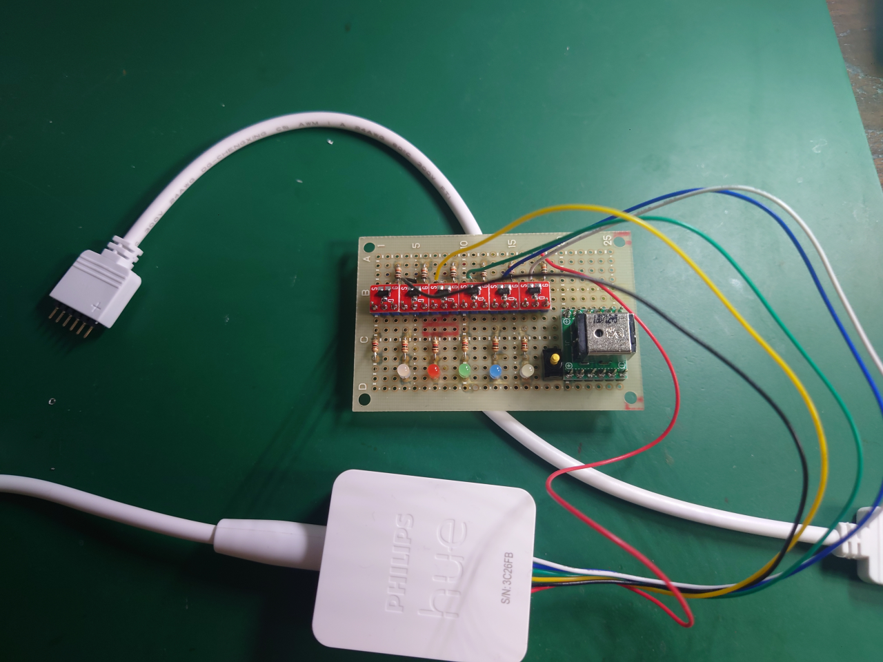 HUEのライトリボンプラスは24V、マルチカラーLEDテープは12Vですし、乱暴にVCCに抵抗かまして電圧落として、、、なんてやるとHUEが燃えそうな予感がします。