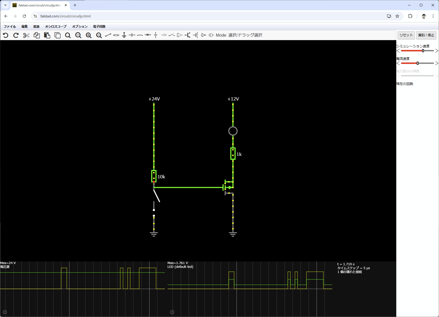 最近お気に入りの、Webで動く回路シミュレータで!。