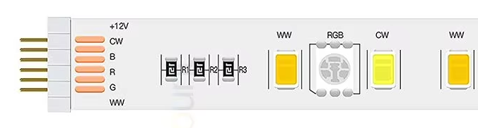 VCCが共通で、R/G/B/WW/CWのGNDが別、つまりGND側をON/OFFする「ローサイドスイッチ」構成ですね。