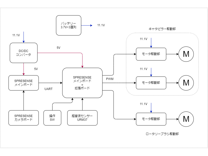 - 電源は、3.7V×3直列をモーター系の電源とし、SPRESENSEボードにはDC/DCコンバータで降圧した5Vを供給します。