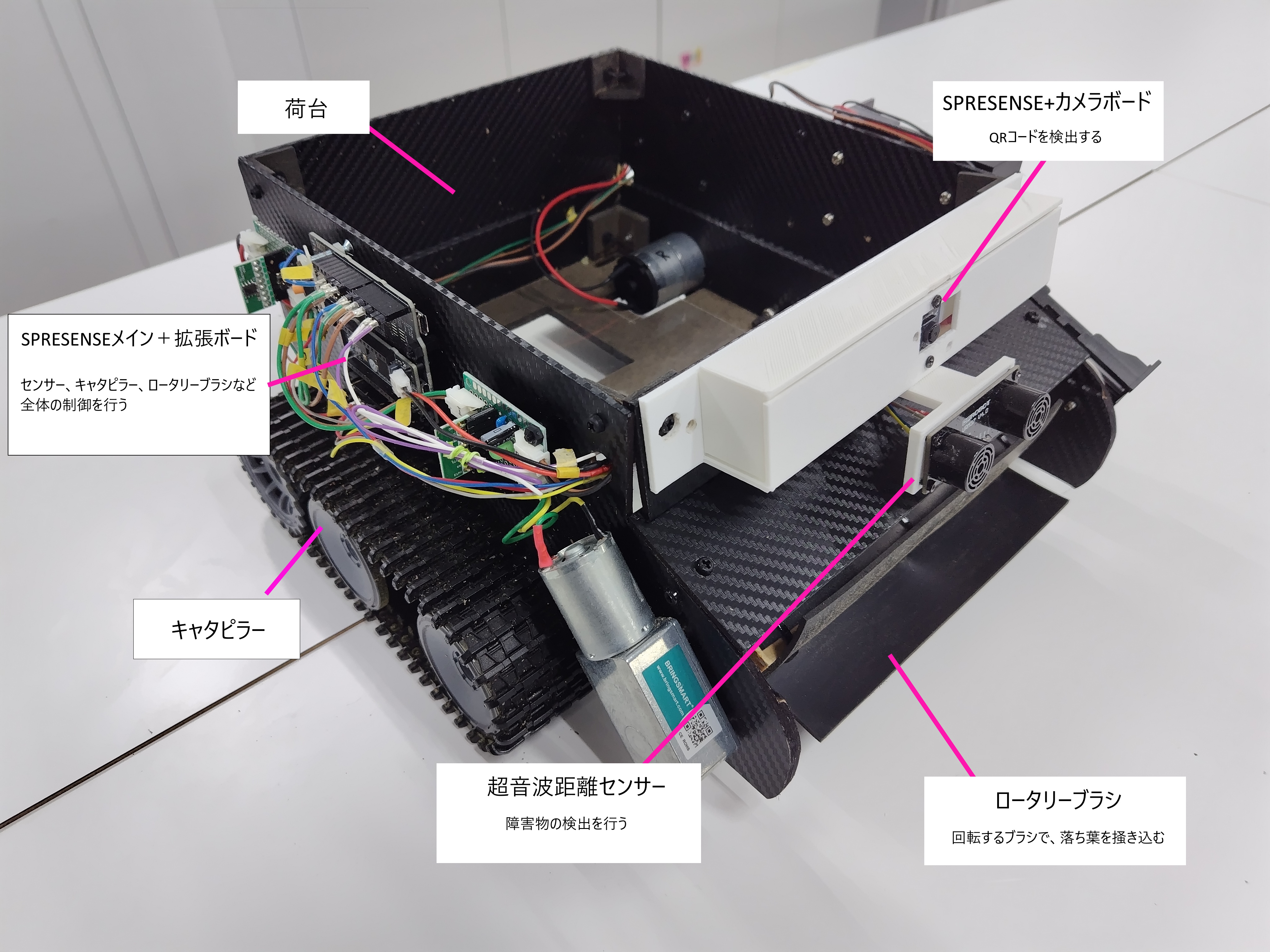 Spresenseを中核に、カメラと超音波距離センサーを用いて庭の状況を把握し、回転するブラシで効率的に落ち葉を回収します。