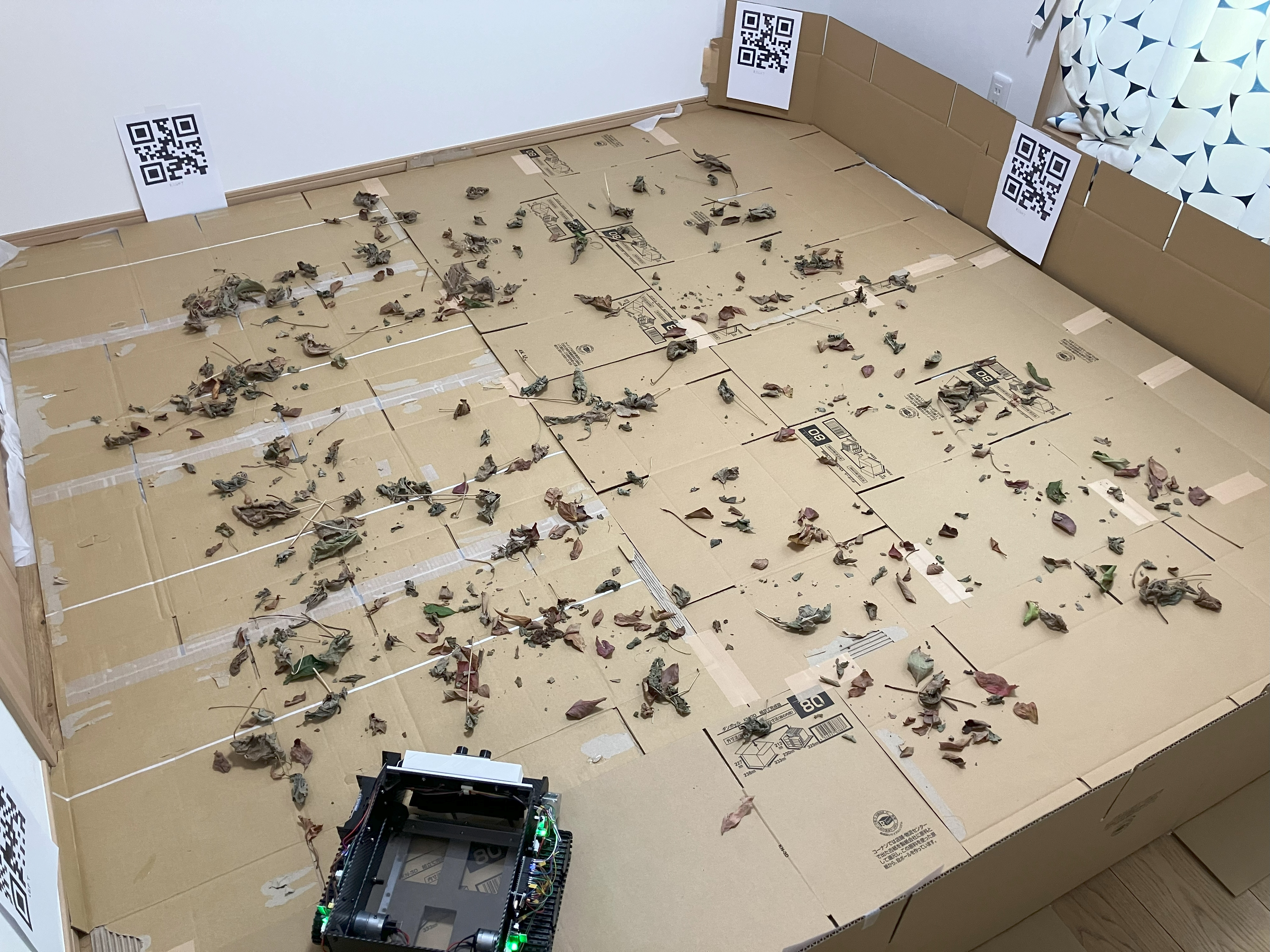 走路上の落ち葉が収集されていることがわかります。ただし、使用した落ち葉が非常に乾燥していて砕けやすいため、砕けてしまったものをすべて拾うことは残念ながらできませんでしたが、大きめの落ち葉はうまく収集できました。