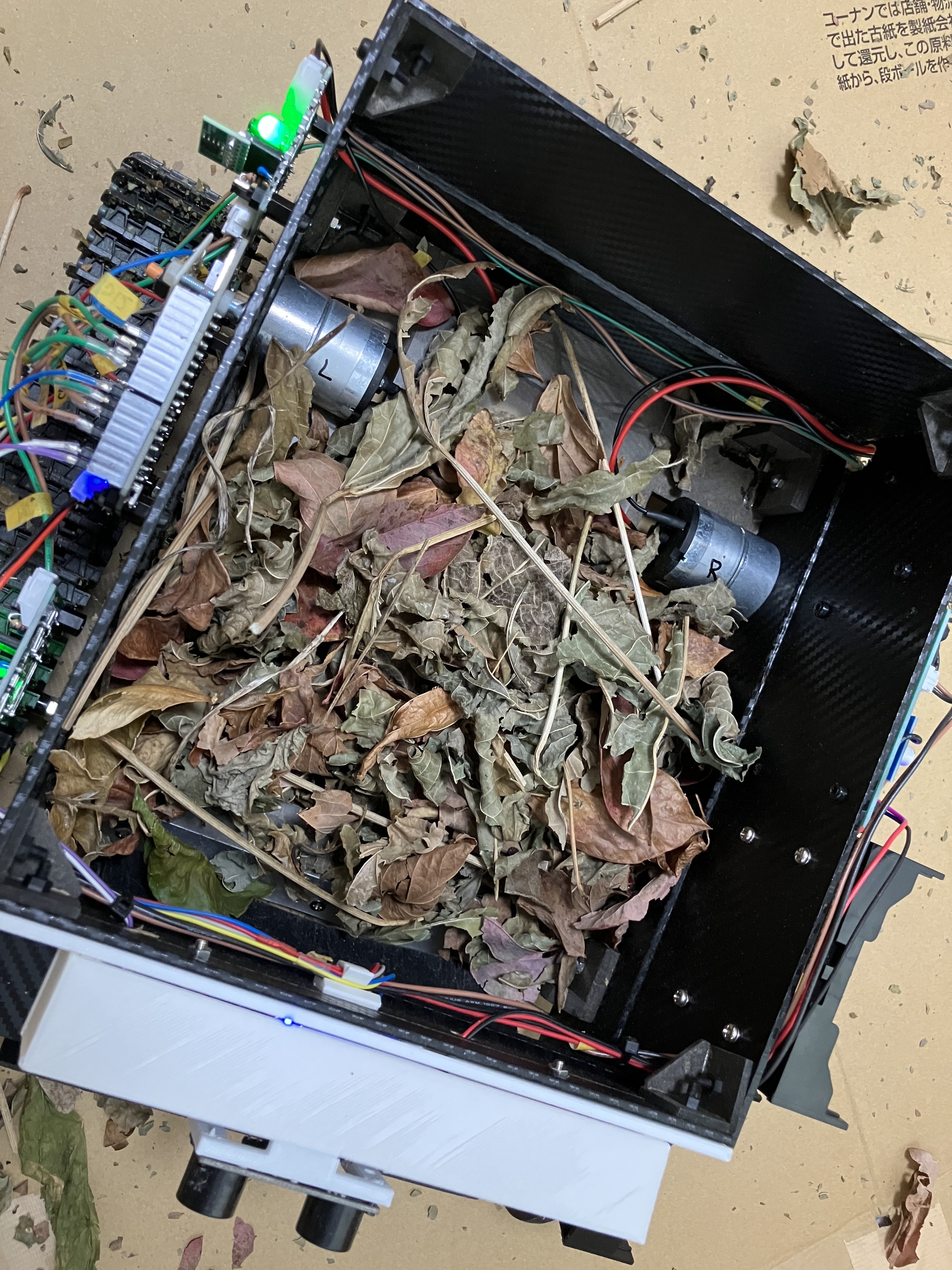 - キャタピラー用に2つ、枯れ葉を掻き込む駆動用に1つの合計3つのモーターを持ちます。