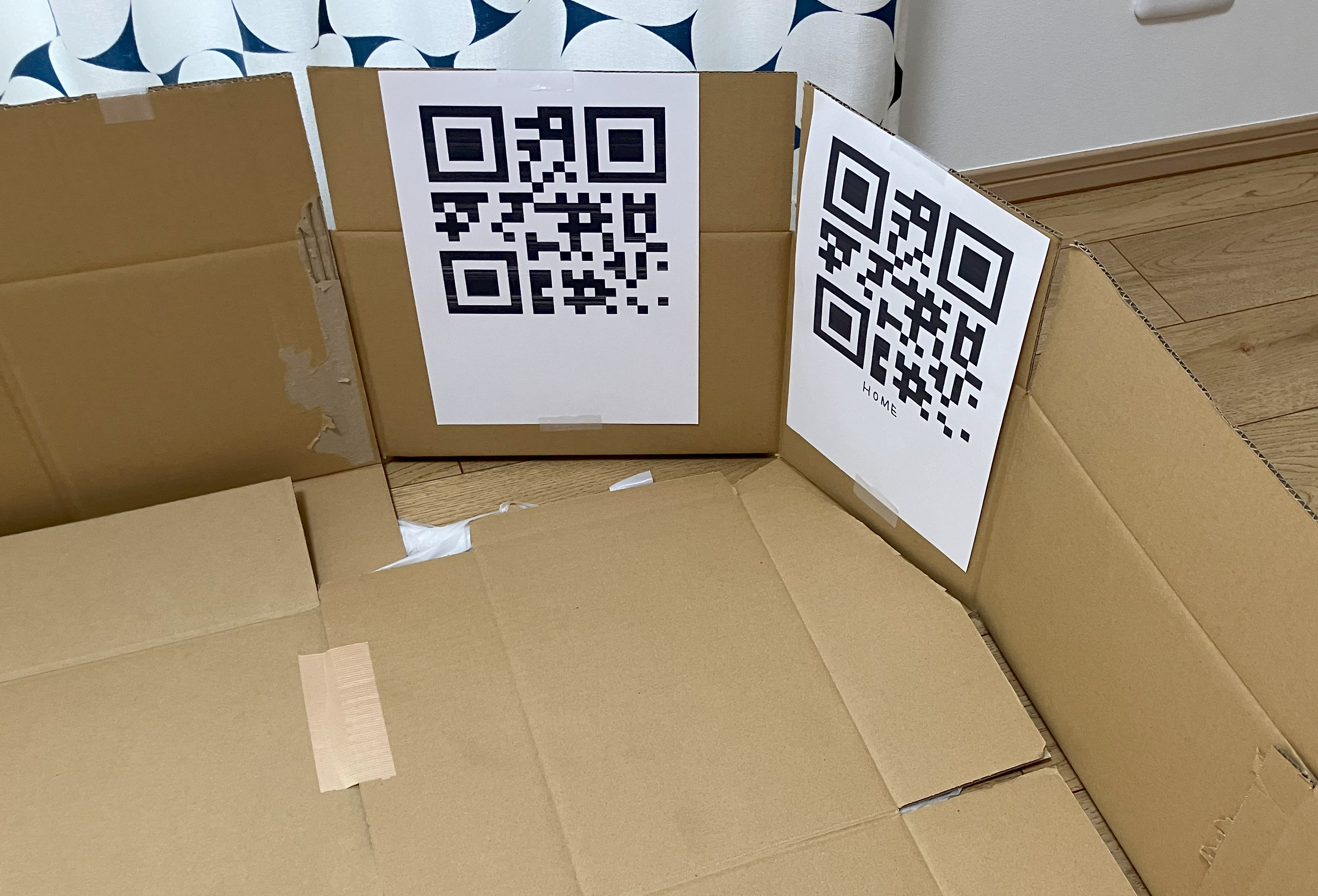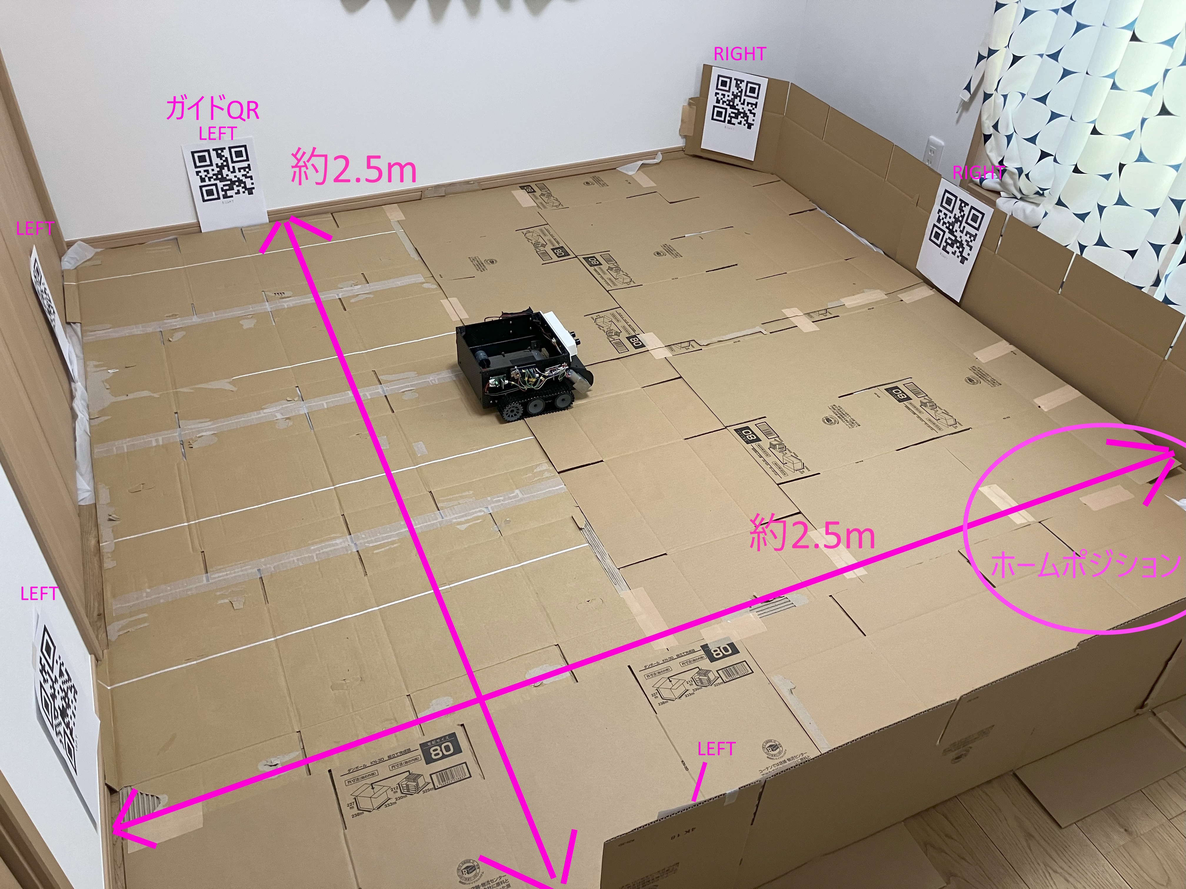 写真右手前の角をホームポジションとして、ホームQRが貼られています。