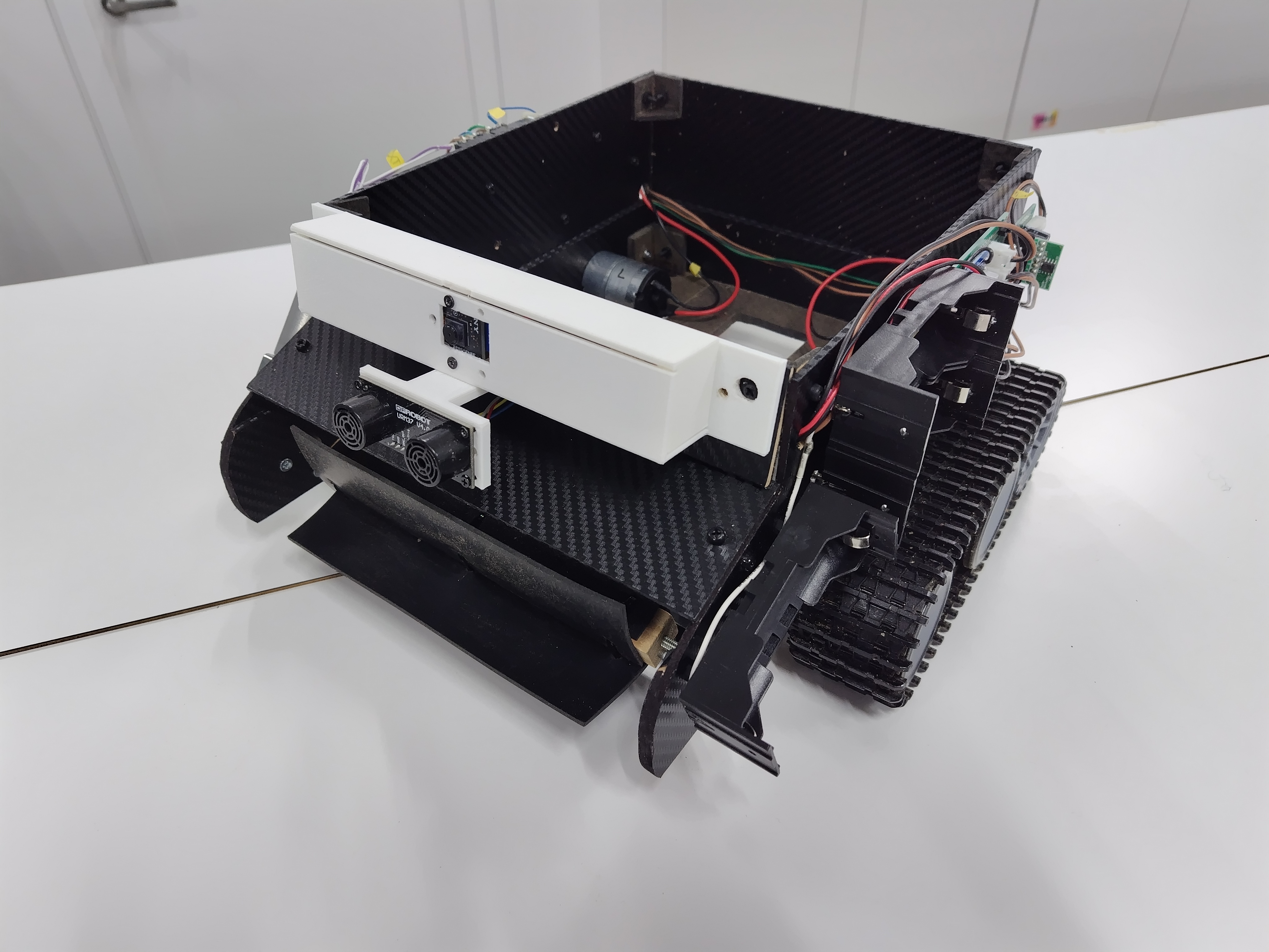 - 超音波距離センサーを1つだけ搭載する簡素なシステム構成であるため、斜めに壁に接近する場合に検出が難しい。壁に近づきすぎてしまっている場合を考慮し、障害物を検知したら少しだけ後退してから回転するなどして回転するスペースを自ら確保した