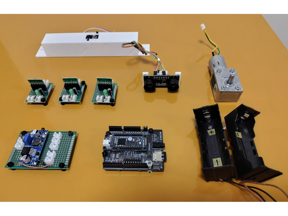モータードライバーICは同一のものを3個。カメラとカメラ制御用SPRESENSEメインボードを格納する部分、超音波センサのホルダーは3Dプリンターで作成しました。