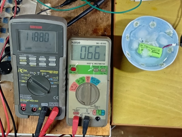 これは電池としては「死亡」してるが1Cで充電を続ける、発熱が激しいので氷水で冷却しながら充電します