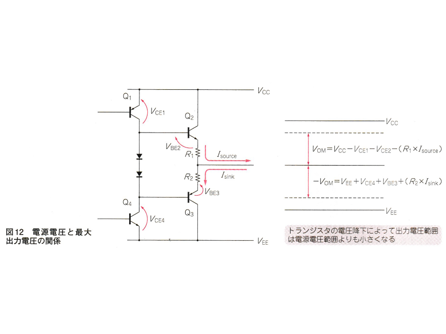 図 12 はオペアンプの出力段の等価回路です。 と の接続点がオペアンプの出力であり、電流が出たり()吸い込まれたり()します。記事本文にある通り、出力電流が増える( が増える)と による電圧降下が増加し最大出力電圧が低下しますね、というお話です。ここまでの記述には全く違和感がありません。
