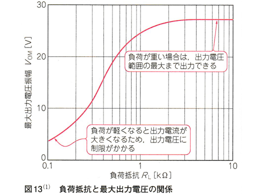 図 13 はオペアンプの出力に接続された負荷抵抗の値と最大出力電圧の関係を表します。グラフの左側に行くほど負荷抵抗の抵抗値が小さく(短絡に近く)なります。抵抗値が小さくなるほど( による電圧降下が増加するため)最大出力電圧が低下することを表しています。先ほどと同じことを言っているだけです。グラフ自体に違和感ありません。