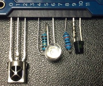 中央がobnizを赤外線リモコン代わりにする赤外線LED と抵抗(10Ω) です。