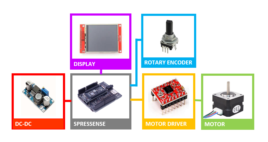 SPRESENSEでステッピングモーターを制御し、ロータリーエンコーダーでモーターの回転数を変更できます。