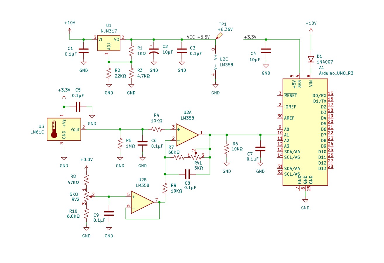 汎用オペアンプ LM358 を使用した温度センサ LM61C 用の直流増幅器です。0~50℃ のアナログ信号をArduino UNO(R3) へ入力します。
