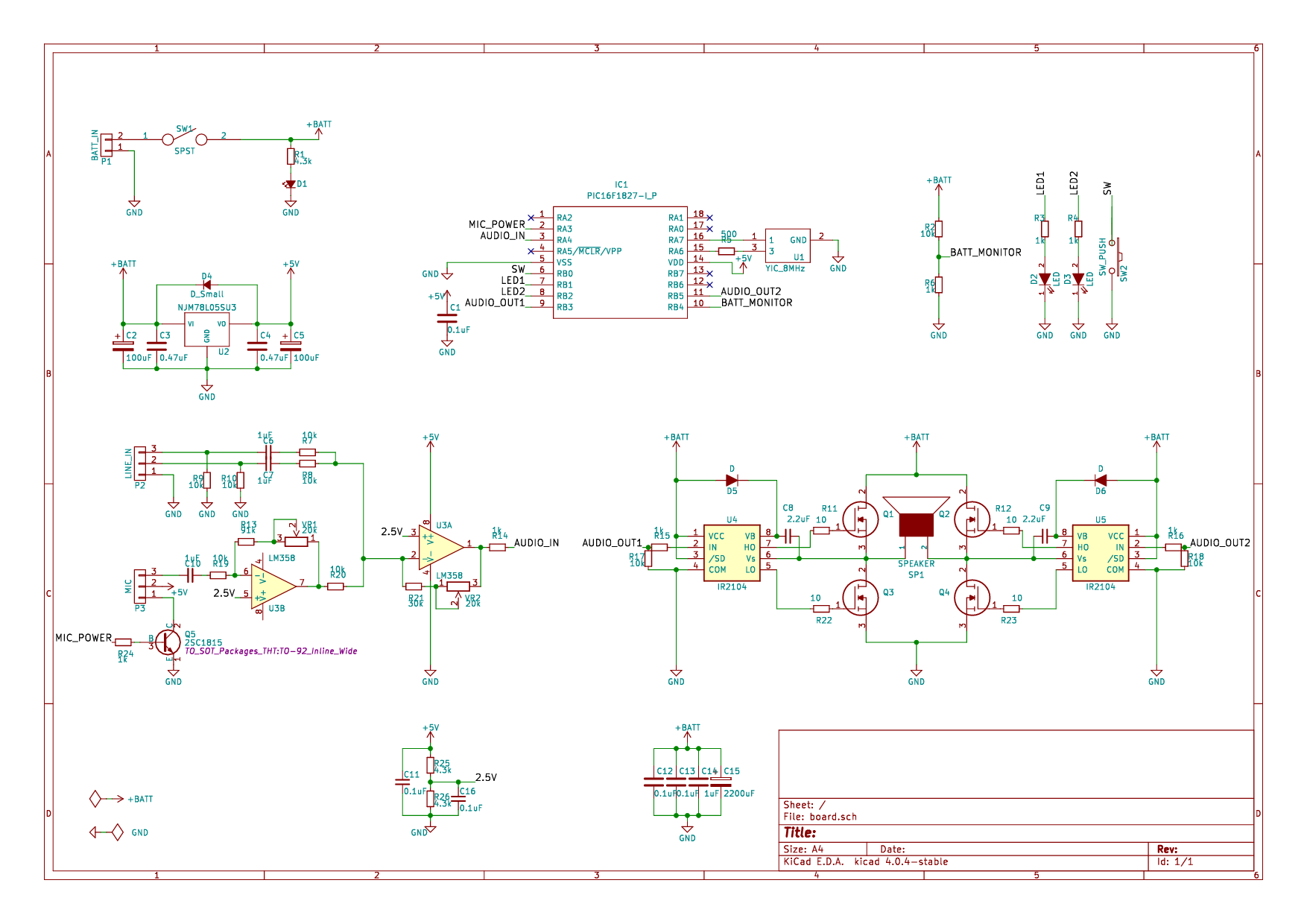 マイクやライン入力の信号をOPアンプで増幅し、マイコンのAD変換器に入れます。変換結果を元にPWMのデューティー比を変化させ超音波を出力します。 -
