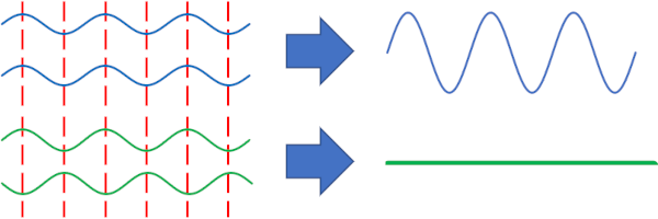 音波の位相が180度ずれている(緑線)とき、互いに弱めあい振幅が小さくなります。