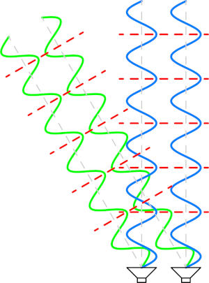二つのスピーカーから音を出したとき、正面に向かって飛ぶ音は強め合い、横に飛ぶ音は弱めあいます。