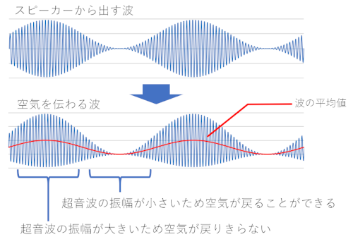 超音波のように周波数が高い場合、次の波が来るまでの間に密度が戻らないため、超音波の振幅を変化させると赤線のように低い周波数の波を発生させることができます。