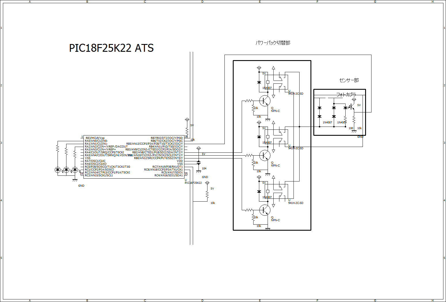 制御はPICマイコンで行い、車両の位置はフォトカプラを使った電流検知回路で検出します。また、閉塞区間1つにつき、1つマイコンを使用し、隣接する閉塞空間に対応するマイコンとUARTで通信をしながら制御を行います。