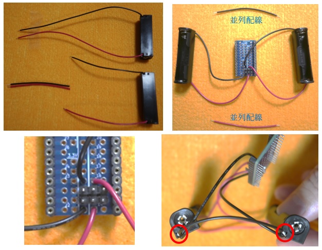 〇電池ボックスからの配線が断線した場合、片方の電池だけが消費されてしまうため電池ボックス同士も配線で接続することにしました。
