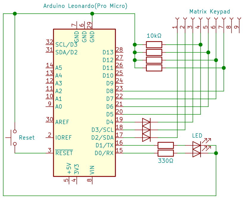 以上を踏まえた回路の例がこちらです。LEDは後述のキーレイヤーの状態を示すのに使います。