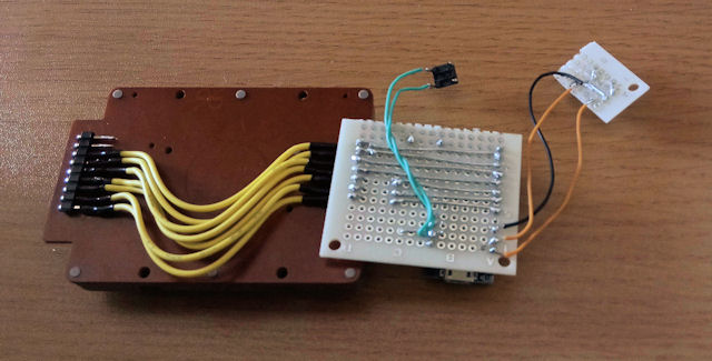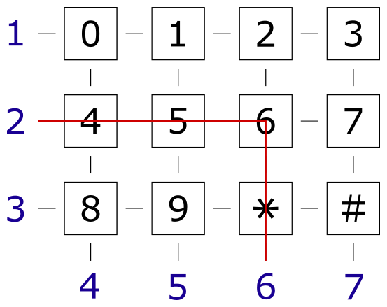 例えば、上記の配線であれば、2番線へ電気を流したときに6番線に出力されているのが確認できたのであれば、押されているスイッチは「6」であることがわかります。