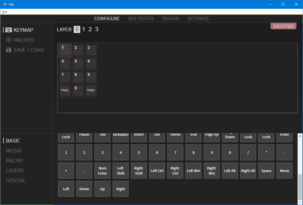 VIAでは4つのキーグループ(QMKではこのグループをレイヤーと呼んでいます)が用意されており、「Layers」キーを割り当てることで、レイヤーの切り替えができるようになります。「MO」なら対象のキーを押している間だけ、「TO」なら一度押すだけで、レイヤーが切り替わります。