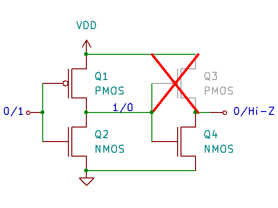 FPGA の I/O の出力部分はおそらく上図のようになっていて、オープンドレイン出力のときは Q3 が無効化される仕組みなのだと思います。(Kenta IDA さんがヒントをくださいました)