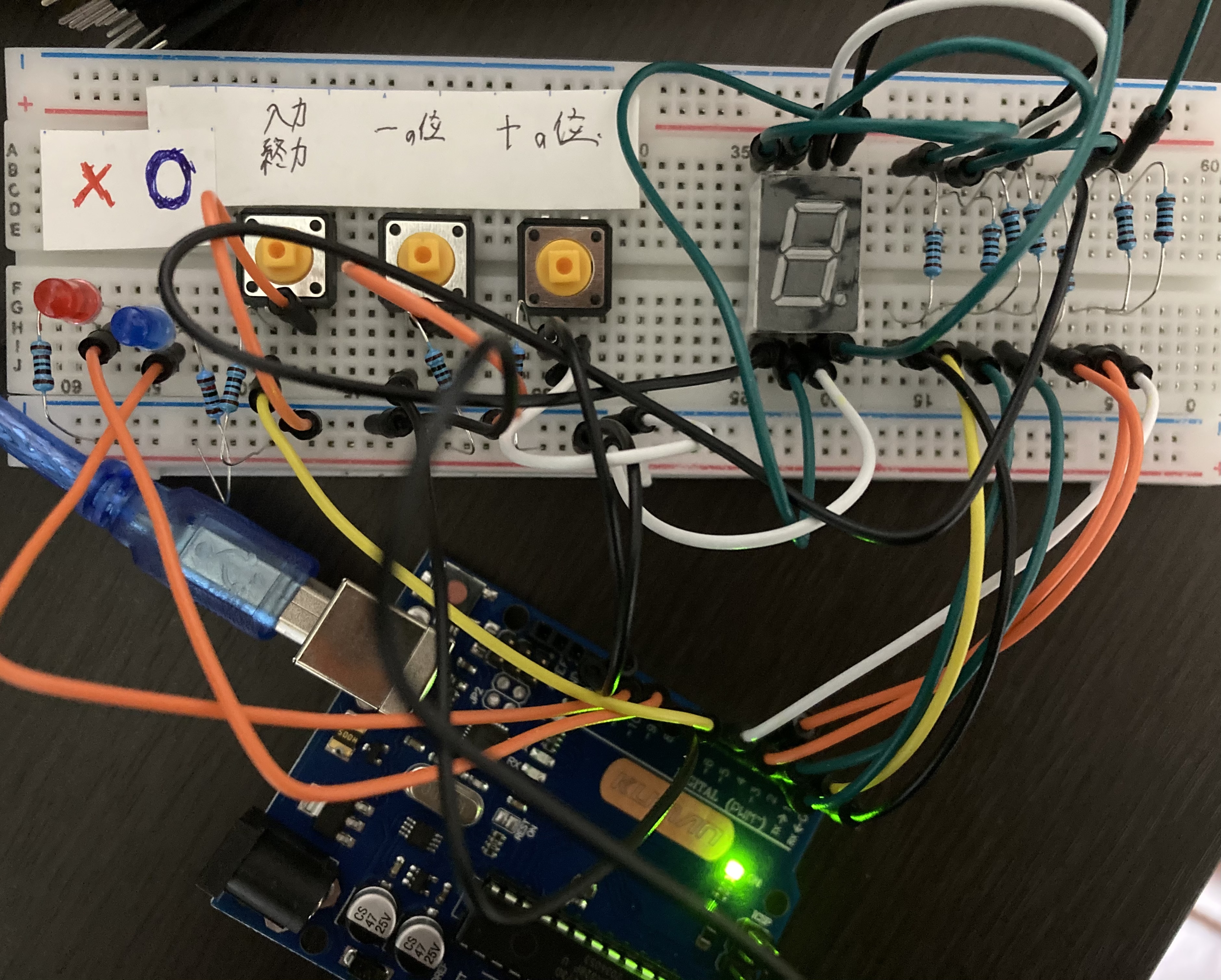 数字は7セグメントLEDを用いて表示。ランダムに表示される1〜9の整数の和を暗算する。