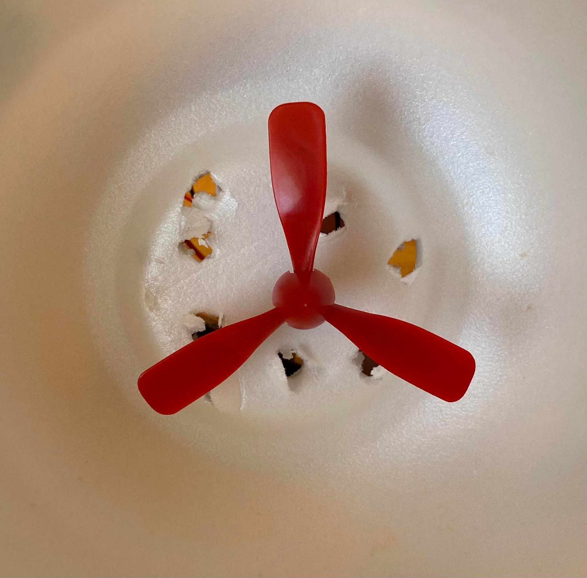 カップ麺の空き容器にモーターとファンをつけその風圧で本体が少し浮きます。